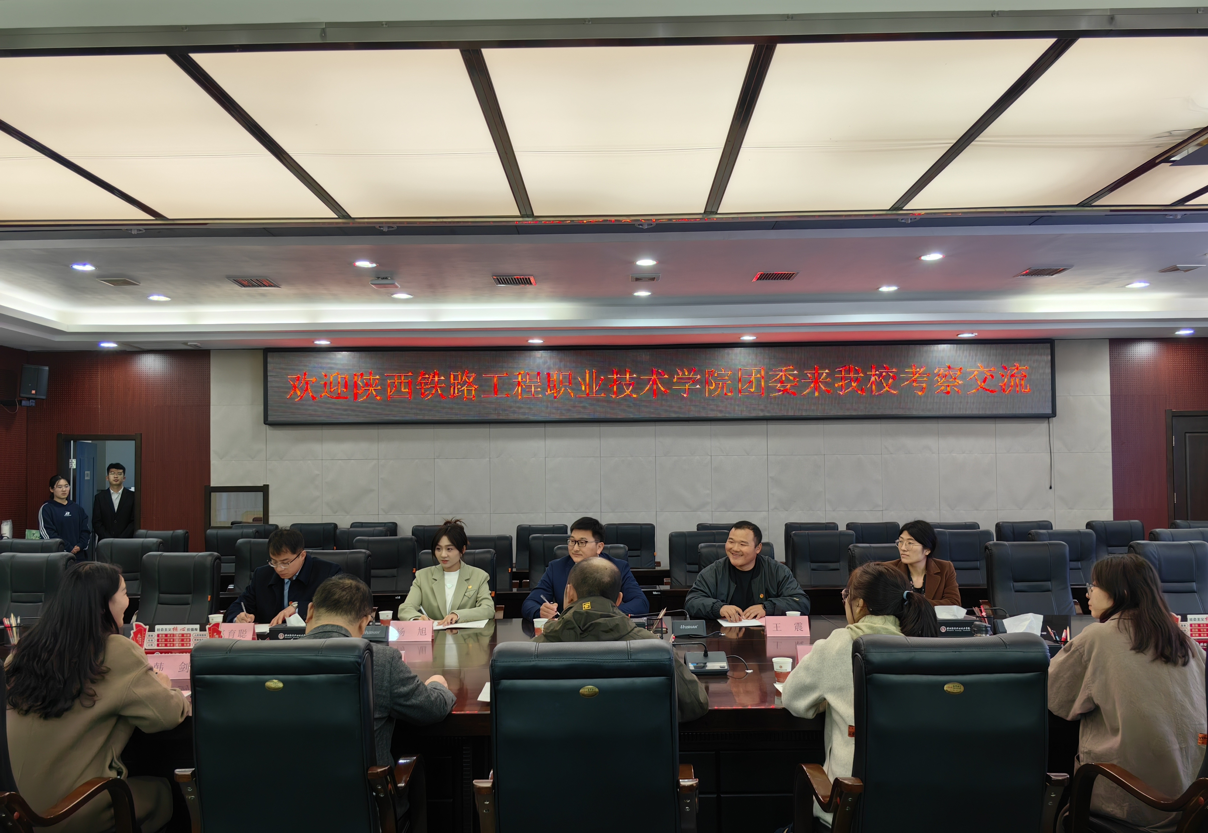 座谈会开始,王皓天对陕西铁路工程职业技术学院一行到来表示热烈欢迎。会上,双方就各校共青团工作的整体情况进行了系统介绍。同时,双方针对共青团改革、第二课堂综合素质育人平台建设情况、美育工作、创新创业、社团组织建设等方面展开了经验交流。