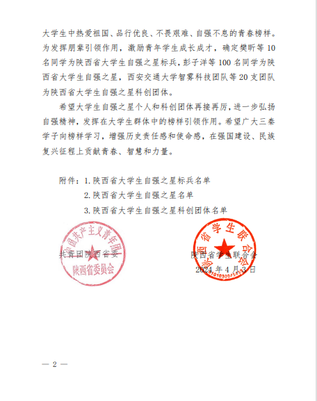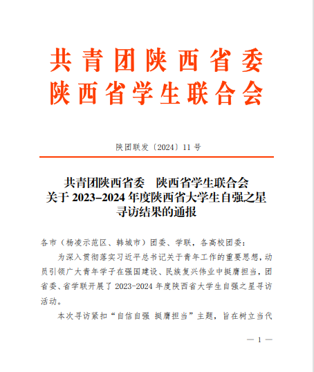近日,由共青团陕西省委、陕西省学生联合会发文,根据《关于2023-2024年度陕西省大学生自强之星寻访结果的通报》文件精神,我校高雨卓同学荣获“陕西省大学生自强之星”称号。