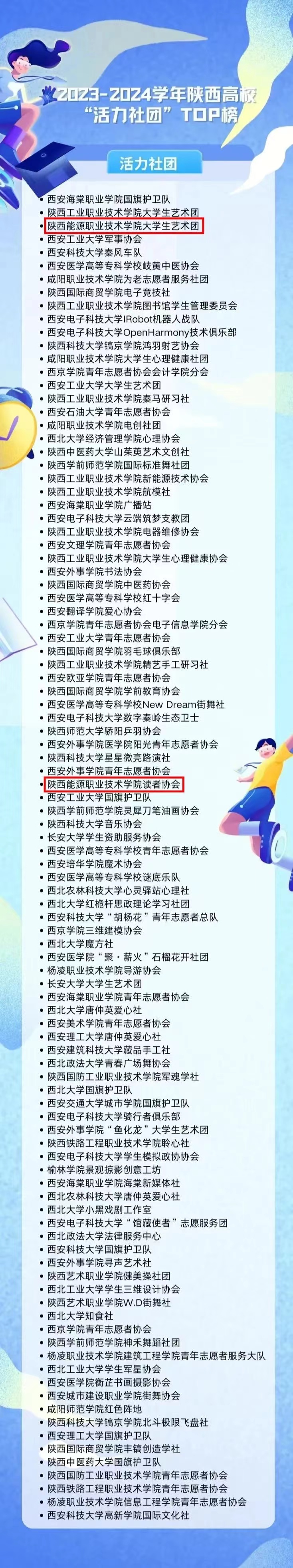 近日,2023-2024学年陕西高校“活力社团”TOP榜单公示,我校大学生艺术团、读者协会社团上榜。