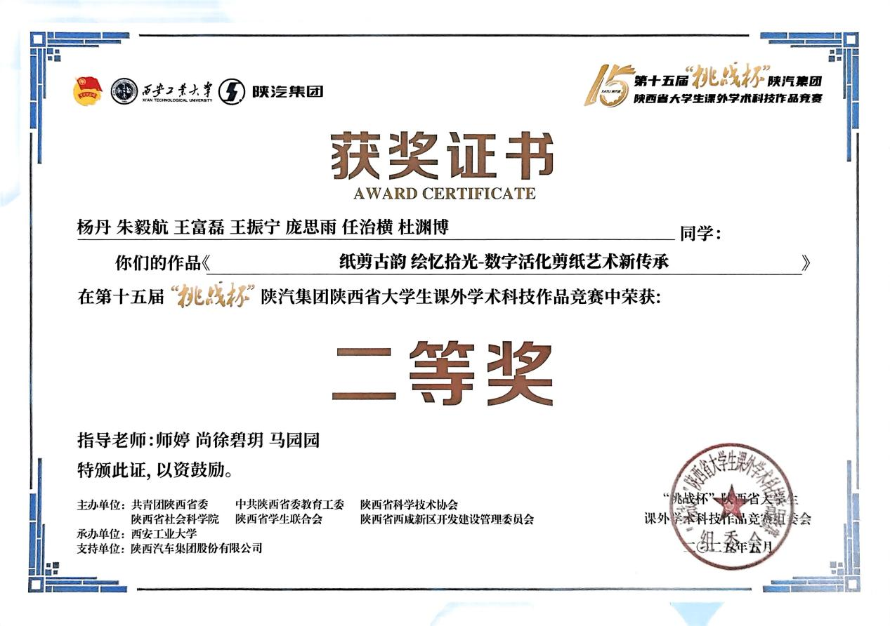 其中一等奖作品《“把脉”社区康复医疗新未来—以陕西省为例基于中医康复服务在社区中应用推广的调查与研究》、二等奖作品《纸剪古韵 绘忆拾光--数字活化剪纸艺术新传承》均为2024年暑期三下乡社会实践成果转化项目,通过深入一线,在基层治理、文化传承等领域的实地调研中挖掘真实问题,为“挑战杯”项目提供选题方向与实证数据支撑。我校通过搭建社会实践平台与“挑战杯”竞赛的双向赋能桥梁,使零散的实践经验凝练为可推广的学术成果,实现社会服务与科研创新的深度融合。