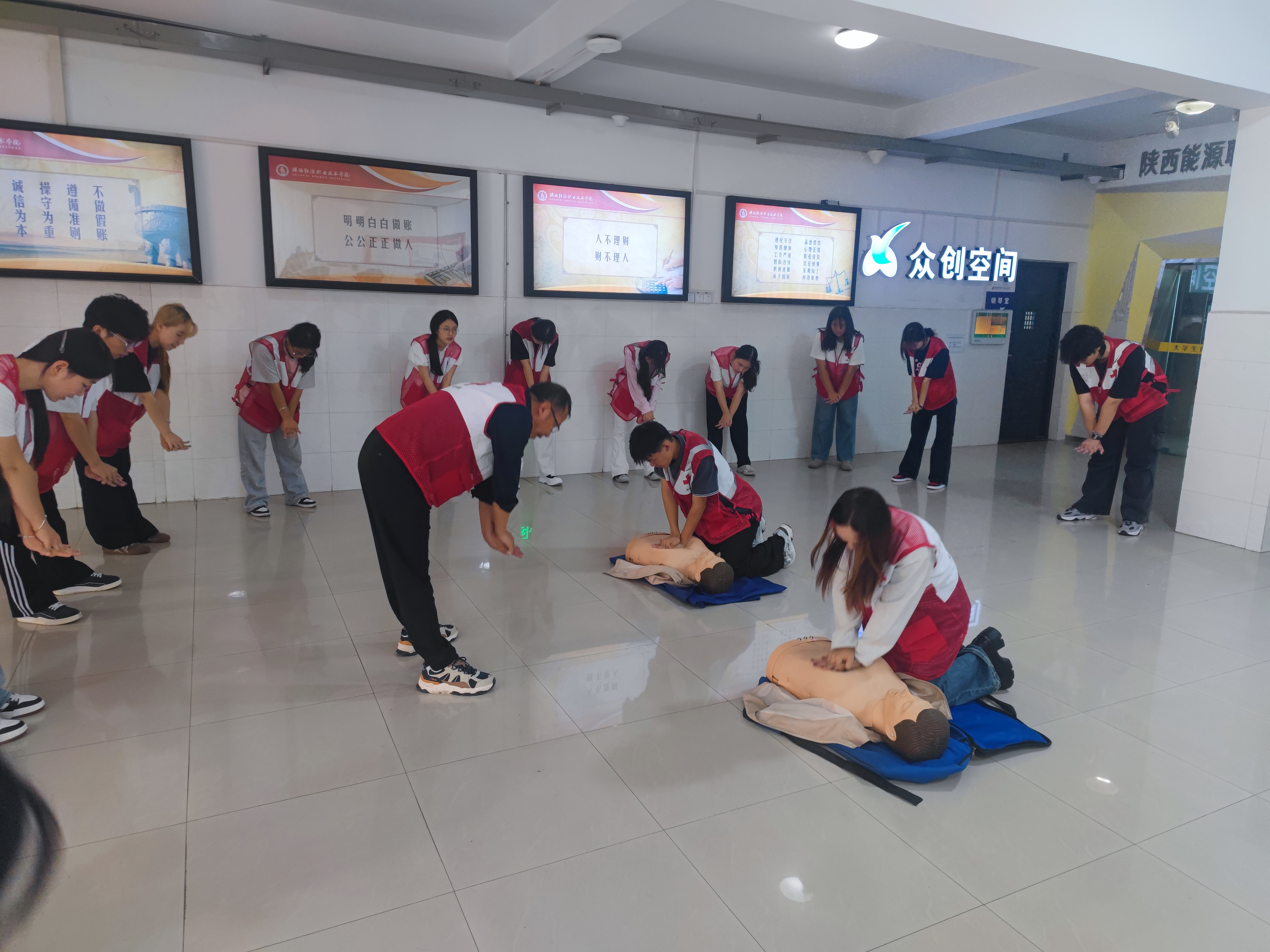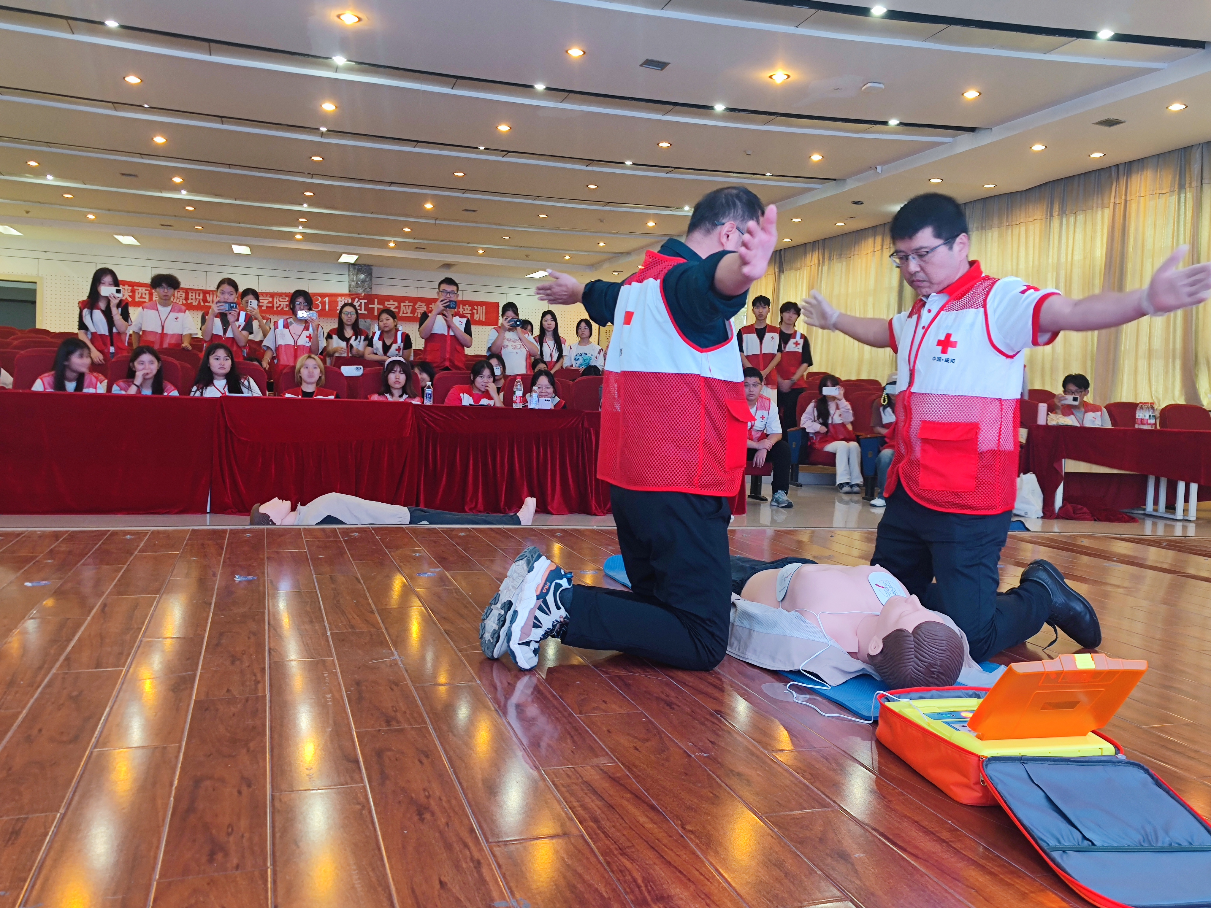 本次培训由咸阳市红十字会协调安排,晁明柱等3位老师担任培训任务。培训内容主要包括:“心肺复苏”、“AED的使用”、“创伤救护”“常见急症处理”等。通过理论+实操的授课方式,经过理论测试和实践考核合格者发放“红十字初级救护员证”。