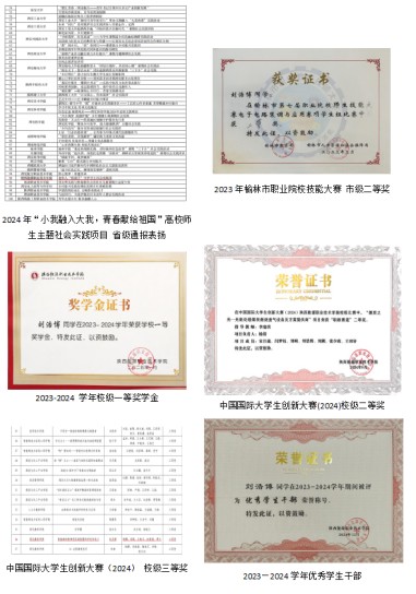 大学两年,“学思融合” 的深耕让刘浩博收获多重肯定,累计 20 余项荣誉证书,印刻着从 “专注技能提升” 到 “关注价值创造”、从 “个人成长突破” 到 “群体发展赋能” 的蜕变轨迹。