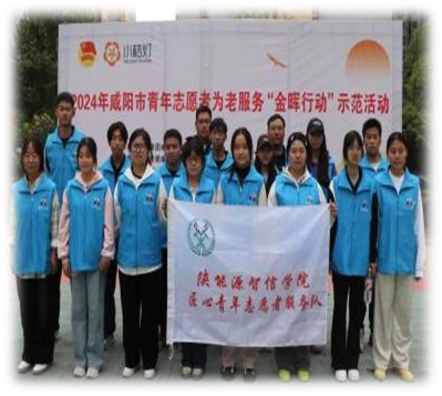 2024年,咸阳市青年志愿者为老年人服务“金晖行动” 示范活动开展。陕能院智信学院匠心青年志愿者服务队积极参与,身着蓝色志愿服的他们,在活动现场汇聚力量。走进社区,为老人送去关怀,陪老人唠家常、帮老人整理物品,用实际行动践行 “奉献、友爱、互助、进步” 志愿精神,让 “金晖” 照亮老人的生活,也让青春在服务中闪光。