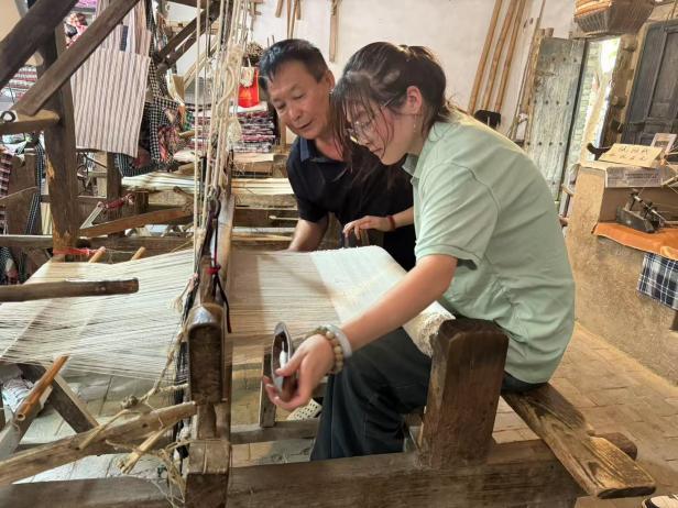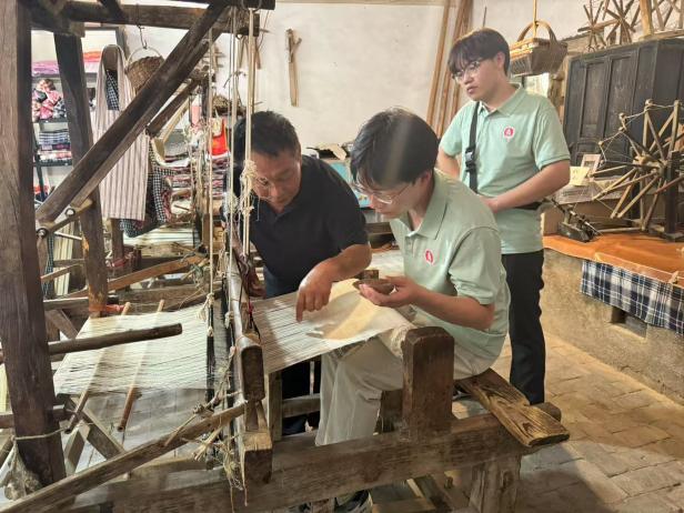 随后,队员们来到织布体验馆,体验传统的织布技艺。在传承人的耐心教导下,大家尝试操作体验,脚踏踏板,手牵丝线,随着梭子在织布机上的灵活穿梭,队员们不仅体会到了先辈们的勤劳与智慧,还感受织布机的独特节奏和传统手工艺传承的不易。
