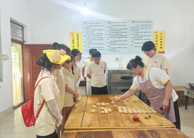 活动中,实践团成员积极参与各项活动,亲身感受传统民俗文化的魅力。园内负责人带领实践团参观了传统农具,大家亲手操作石碾、石磨,在劳作中体会农耕时代的生产智慧;在纺织机前,成员们尝试纺线织布,近距离感受传统农耕与手工业文化的智慧,感受手工业者的辛劳与坚守。手艺人现场展示非遗项目鹿糕馍的制作技艺,学生们参与实践制作,深度体悟饮食文化的传承脉络;随后,实践团参观园内古画与名人书法作品,在笔墨间感悟传统文化的文字魅力与精神内涵;最后,通过观赏墙面壁画展板中呈现的名言、民俗方言等内容,进一步深化对当地民俗文化的认知。