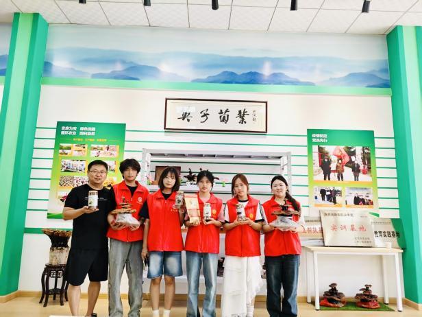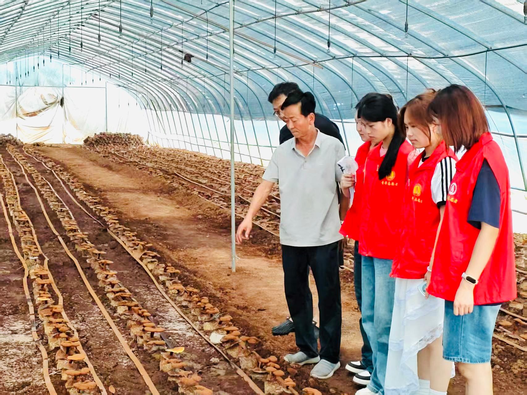 随后,实践团前往宝鸡市陈仓区英子种植专业合作社,了解其绿色农业的循环经营模式。进入大棚,队员们看到了别样的景致:成千上万朵形状各异、大小不一的灵芝盘紧密相连,色泽温润,有的像撑开的小伞,有的像一把扇子。展厅里,形态各异的灵芝工艺品令人眼花缭乱。合作社负责人介绍道:“灵芝的孢子粉晾干破壁后再深加工,就成了灵芝孢子油等系列产品。另外,我们还会把株型美观的灵芝加工成各种样式的灵芝摆件和工艺品。”陈仓区英子种植专业合作社是一家集富硒小麦种植、食用菌栽培及农林废弃物循环利用为一体的综合性农业科技型企业。近年来,合作社按照“村级集体经济+合作社+帮扶户”的模式,发展羊肚菌、灵芝等珍稀食用菌产业,形成了合作社发展与村集体经济收入大幅增加的双赢局面。