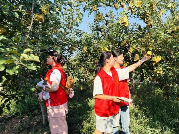 随后,实践团又来到了凤翔区范家寨镇千亩苹果示范园,已套袋的苹果挂满枝头,像一个个小灯笼,象征着村里丰收的希望。近年来,范家寨镇大力发展果树种植,推进产业发展,助力群众增收致富,为实现全面乡村振兴奠定了坚实的基础。如今,凤翔区已成为全国“矮化”苹果种植面积最大的县,从被评为“苹果标准化示范区”和“全国现代苹果产业30强县”,到获得“农业农村部地理标志登记产品”认证,凤翔苹果连续六年登上价值榜,品牌价值评估超过17亿元,凤翔苹果产业已步入高质量发展阶段。