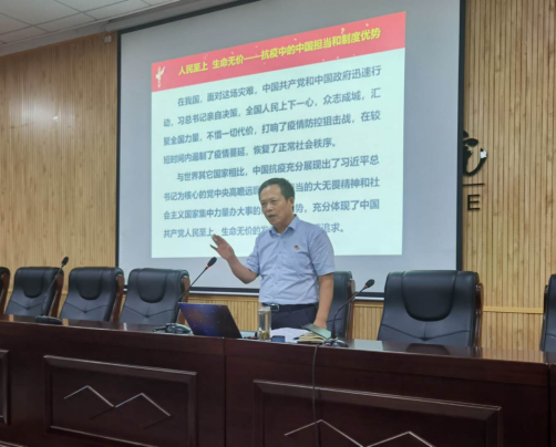 首先,党委书记令狐培选以全球疫情防控中的中国优势与青年学生的使命担当为主题。从国际时局形势出发,通过一个个具体事件,深入浅出的对此次报告做了深入解读和细化讲解,让现场师生体会到抗疫当中的中国担当与制度优势,更加坚定对共产主义的信念、对社会主义的信心、对中国共产党的信任,把自己的命运与国家民族的命运紧密联系在一起,肩负起中华民族伟大复兴的使命担当,更加勤奋地学习、更加积极地实践,以良好的思想道德、丰富的文化知识、扎实的技术技能,健康成长,努力成才,服务人民,造福社会,为国家建设作出自己应有的贡献。他希望同学们务必保持高度警惕,密切关注疫情形势,严格做好日常防护,自觉遵守各项管理规定,确保师生安全和学校稳定。