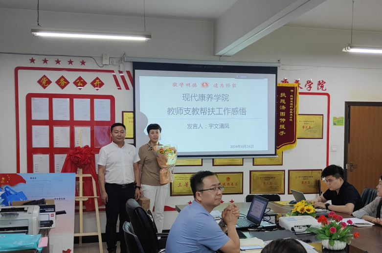 学院党总支书记唐恭贺代表学院代表学院全体师生向宇文老师表示衷心的感谢,并送上鲜花和慰问纪念品。他指出,支教帮扶工作是一个崇高而伟大的事业,现代康养学院积极响应国家和学校的号召,把支教帮扶工作融入到学院的发展与实践之中。宇文老师以及目前正在支教的袁晓媛老师用实际行动书写着教育工作者的崇高使命和伟大情怀。后续,学院也将制定具体举措全力支持支教工作者,确保支教帮扶工作持续、稳定、有效地开展。