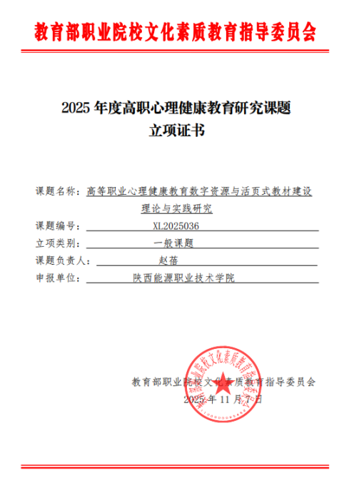 11月9日,我校党委学生工作部心理健康教育中心教师赵蓓老师申报的《高等职业心理健康教育数字资源与活页式教材建设理论与实践研究》课题,经我校科研信息处打磨申报、教育部职业院校文化素质教育指导委员会评审,在500余份申报书中脱颖而出,成功立项。