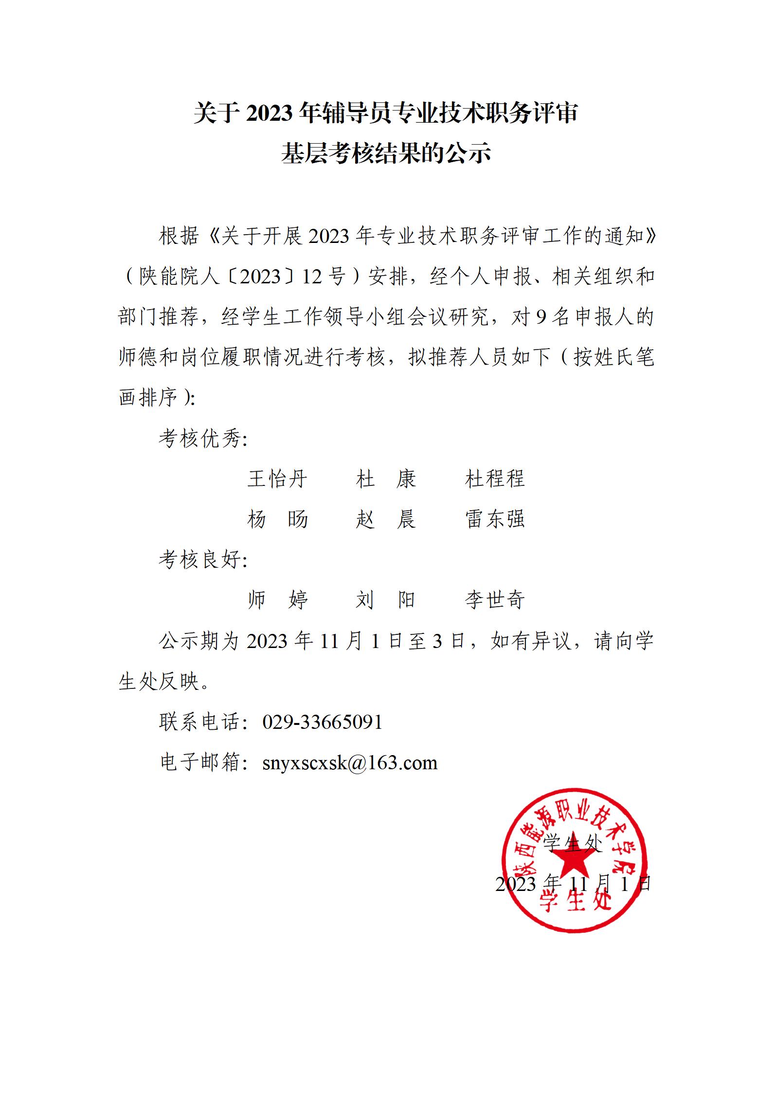 关于 2023 年辅导员专业技术职务评审基层考核结果的公示