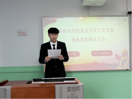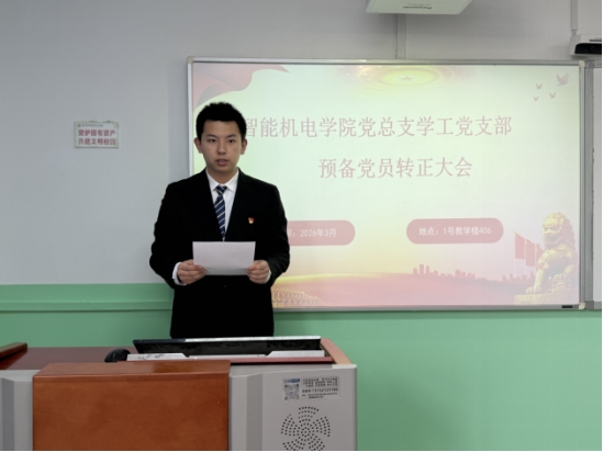 2026年3月18日下午,智能机电学院党总支学工党支部在1号教学楼407教室召开2026年预备党员转正大会,专题讨论申锦江等五名预备党员转正相关事宜。会议由学工党支部组织委员尹艳玲主持,学工党支部全体教师党员、入党介绍人及本次转正预备党员出席会议,学院党总支副书记王皓天、焦娇参会指导。